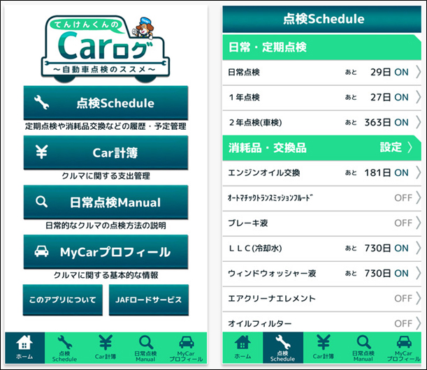 自動車整備振興会では、お手持ちのスマートフォンから点検・整備や消耗品の交換時期などを定期的に教えてくれる定期点検促進アプリ「てんけんくんのCarログ」を
